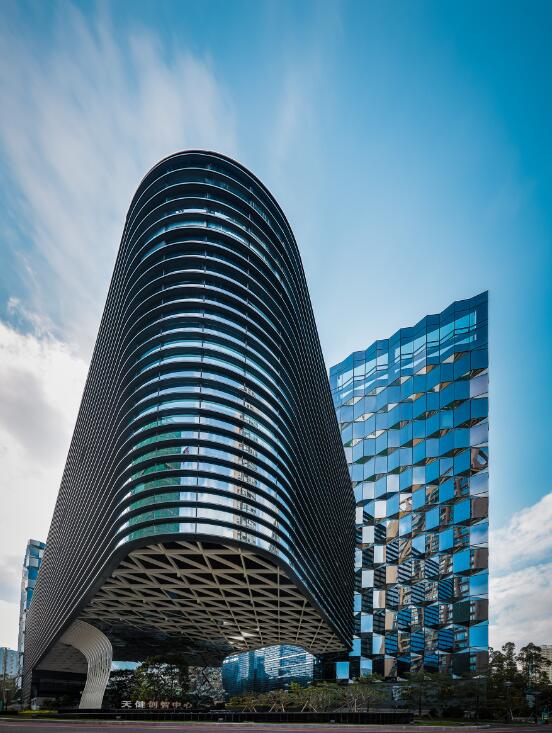 水貝金座大廈幕墻玻璃采用綜合性能較高的LOW-E中空玻璃; 3D打印彩釉,用內部燈光營造出絲綢的皺褶效果。玻璃、陶土板等面板,95%以上是在工廠加工,大大節省了現場施工時間,保障了工程的順利完工。
