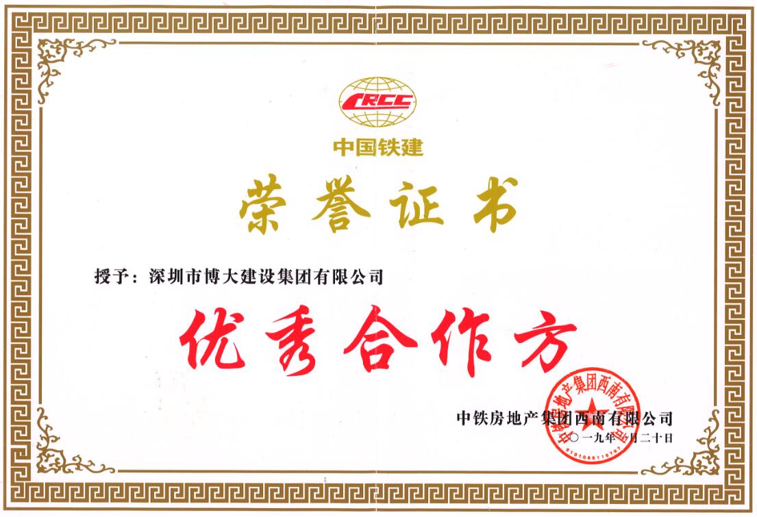博大建設(shè)集團(tuán)以?xún)?yōu)秀的工程質(zhì)量和準(zhǔn)時(shí)交期,協(xié)助中國(guó)鐵建奠定了西派國(guó)樾精裝大平層的品牌效應(yīng),榮獲中國(guó)鐵建優(yōu)秀合作方。