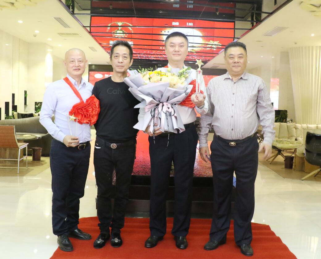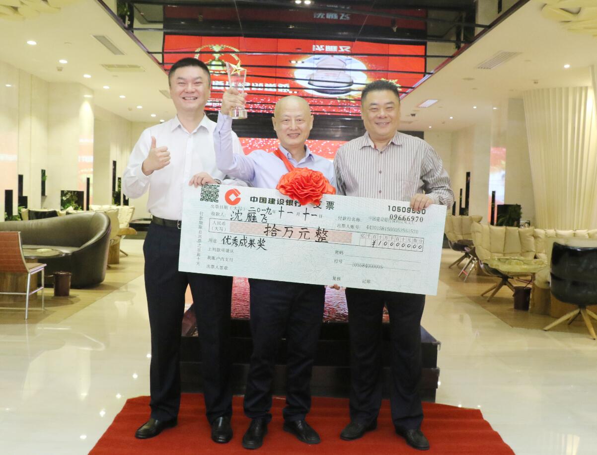 集團(tuán)常務(wù)副總裁沈雁飛在集團(tuán)業(yè)務(wù)拓展中做出突出貢獻(xiàn),被授予優(yōu)秀成果獎,獎勵10萬元。圖為徐凱宏董事長、黃河副董事長與獲獎?wù)吆嫌傲裟睢?br />