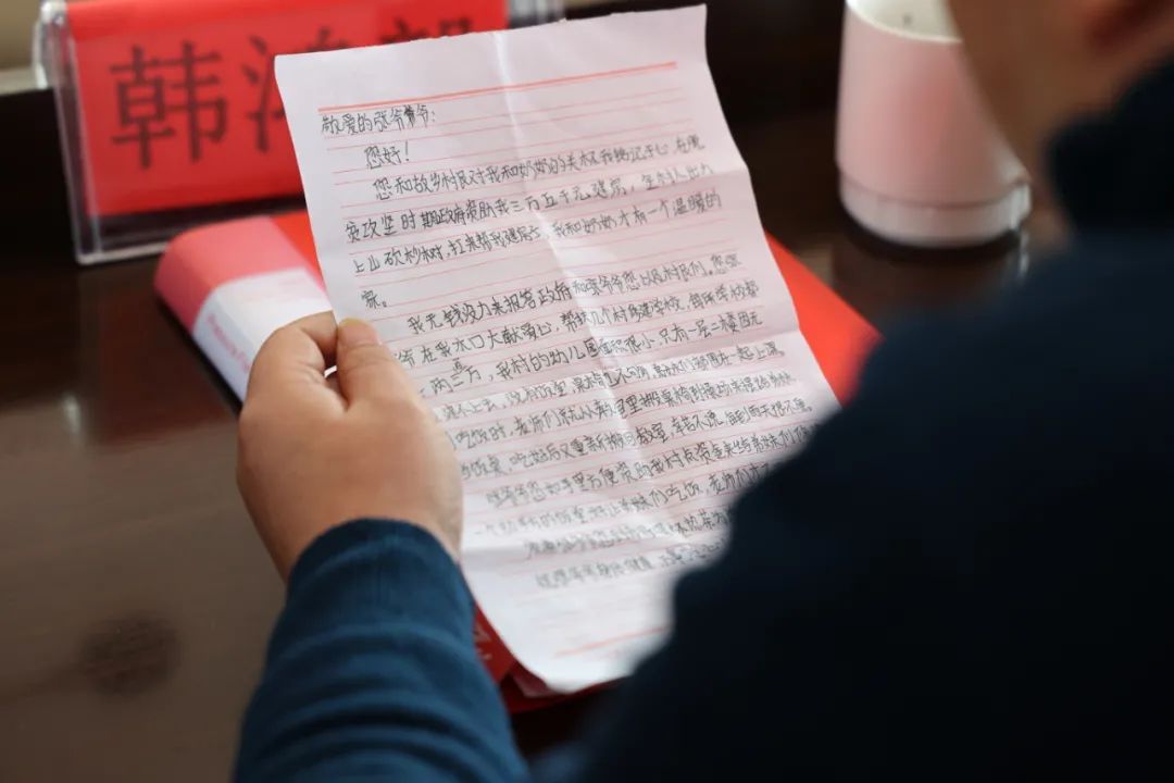 圖 | 黎平縣政協副主席韓鴻毅朗讀受資助的貧困兒童寫的感謝信